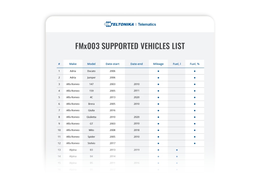 Lista obsługiwanych pojazdów ze wszystkimi dostępnymi modelami i parametrami producenta.